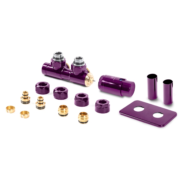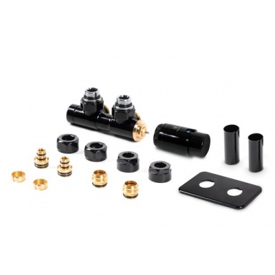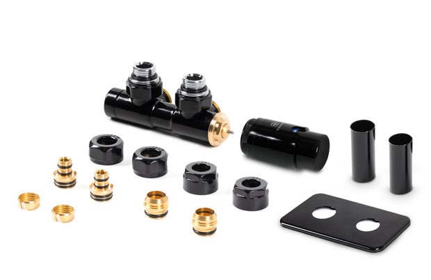 Súprava obsahuje: integrovaný termostatický ventil rohový, termostatickú hlavicu M30x1,5; kryciu súpravu, 2x adaptéry AL-PEX Ø16x2 a meď Ø 15.